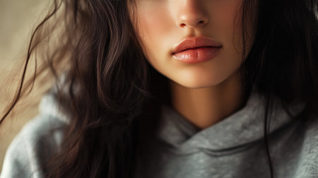 Close up of woman face, highlighting her smile and soft features. image captures warmth and joy expressed through her lips and hair, creating inviting atmosphere