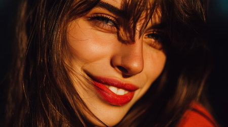 Close up portrait of young woman with long, flowing hair, smiling warmly. sunlight highlights her features, creating soft glow her skin. Her bright red lips contrast beautifully with her natural