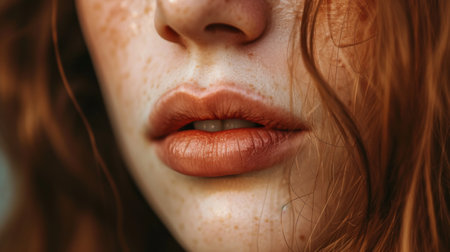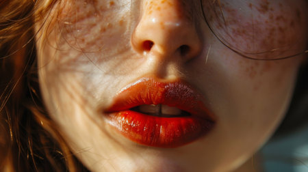 A womans lips, lightly touched with red lipstick, and a freckled complexion. Her auburn hair flows gently across her face, adding a touch of softness and mystery to the intimate portrait.