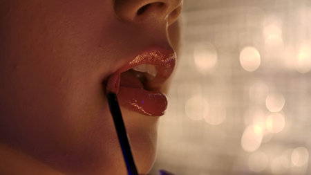 Close-up photography showcasing glossy lips with a vibrant shimmer. The colorful light reflects off the surface, highlighting beauty and artistry.