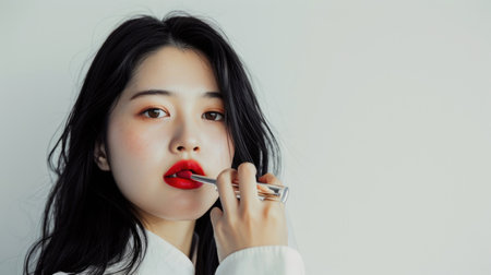 The picture of the red lips young beautiful asian woman looking at the camera while holding the red lipstick near the mouth while wearing white shirt with white background for advertisement. AIGX01.