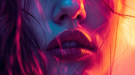 Illuminated lips and smooth skin create a striking beauty portrait, highlighting the elegance and glamor of the female model's features