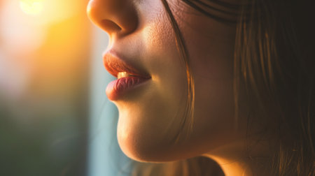 Close up of lips glowing softly in warm light during sunset highlighting the natural color and texture evoking a peaceful atmosphere.
