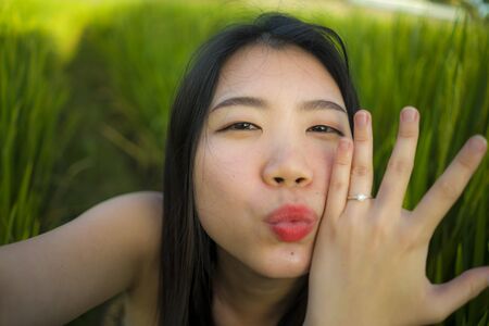 young happy and beautiful Asian woman taking selfie photo outdoors showing proud her engagement ring. cheerful Korean girl as fiance taking self portrait at green field enjoying holiday