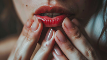A close-up of a womans lips partially covered in soft shadow, creating a mysterious and intimate atmosphere. The image focuses on subtle beauty and gentle lighting.