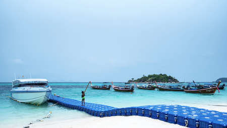 relaxation concept of long tail boats float on the clear blue sea taken at Lipe Island, Satun, Thailand on 8 April 2017
