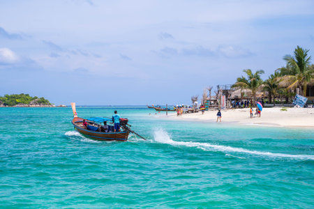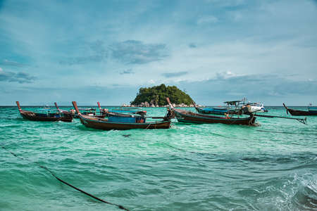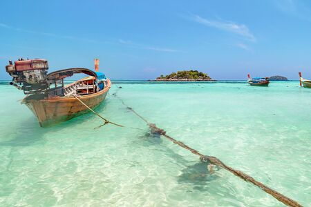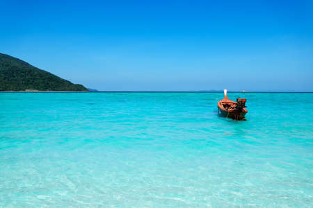 Long tail boat on the sea at Ko Lipe island, Thailand. Tropical island with white sand, beach and turquoise sea is part of Tarutao National Marine Park. Idyllic vacation, relaxation in paradise.