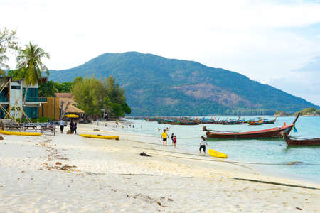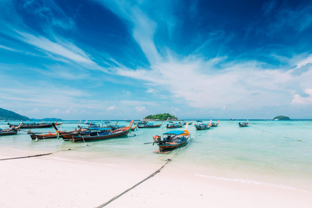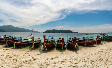 Koh Lipe, Thailand 12.10.2021 Thai traditional Long tail boats resting on the shores of the magical island Koh Lipe