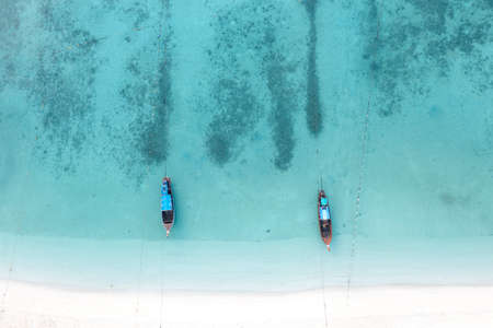 Top view or aerial view of long tail boats on the blue sea with white beach.