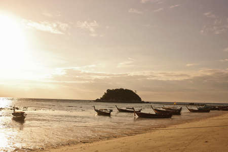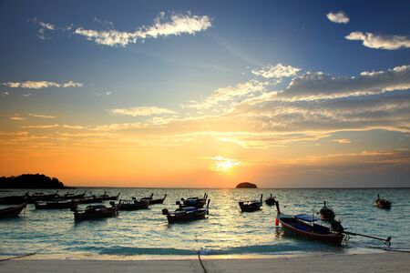 Beautiful sunset and Thai local fishing boats on seaside at Lipe island beach of the Andaman sea, in Satun Province of Thailand.