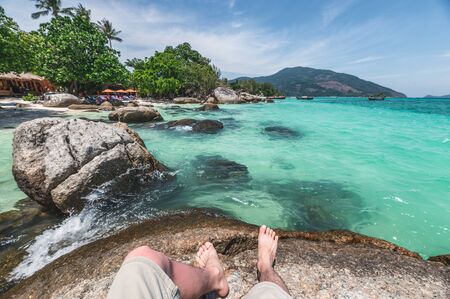 Man sitting recreation on stone in beautiful tropical sea at lipe island