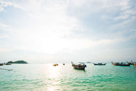 Wooden long-tail boats on tropical sea at sunrise morning beach. Lipe island