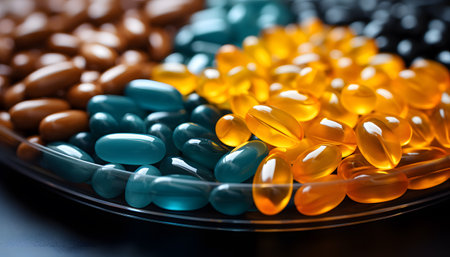 This macro photography of omega 3 supplements showcases the glossy texture and rich, amber color of fish oil capsules, emphasizing their importance in maintaining a healthy diet and lifestyle. High quality photo