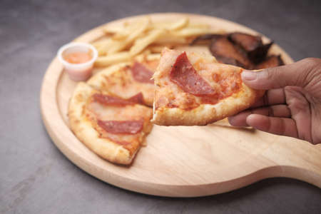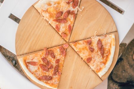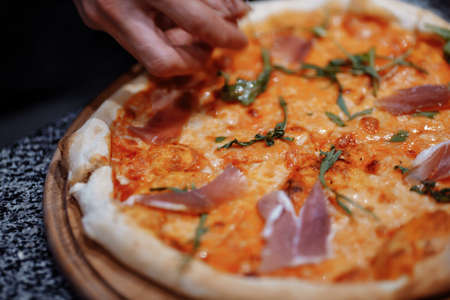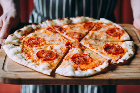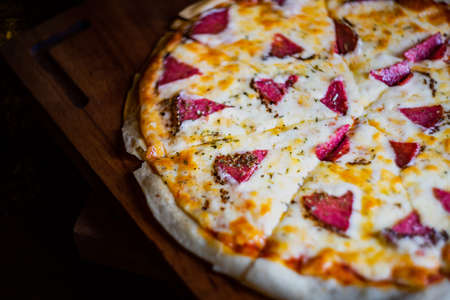 Delicious pizza close up on wooden board and concepts. Italian national food.