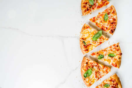 Homemade sliced cheesy classic italian pizza with ingredients and olive oil, white marble background copy space top view
