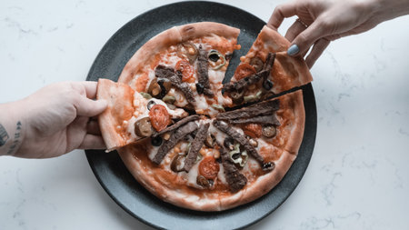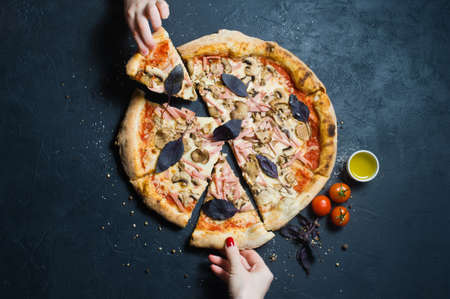 Two hands take a piece of freshly baked Italian pizza. Dark background, top view