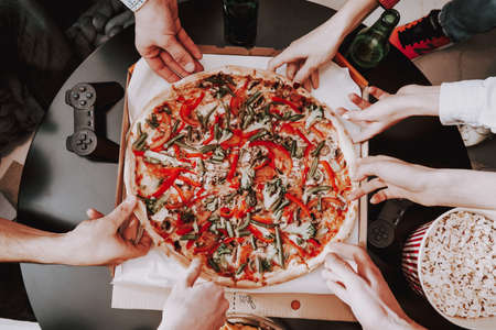 Male hands taking slices of pizza with cheese, tomatoes and ham from food delivery. Group of hungry friends sitting at desk and sharing delicious lunch on table background