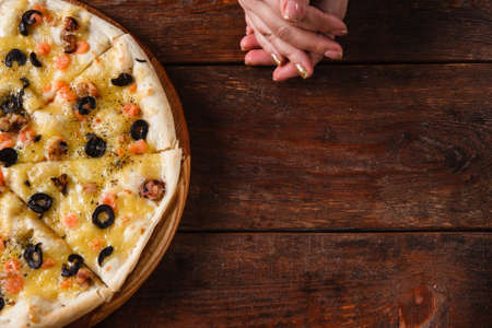 Hot yummy italian pizza served on wooden background, flat lay with free space for text. Italian cuisine. Unrecognizable person hands on rustic dark table.