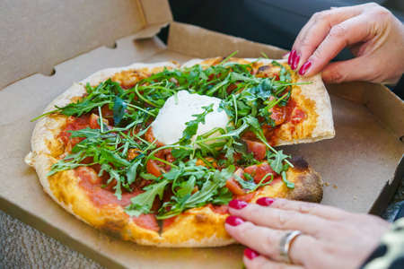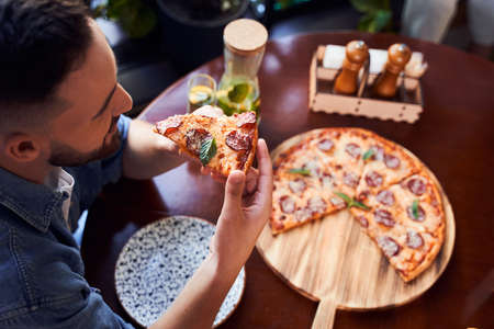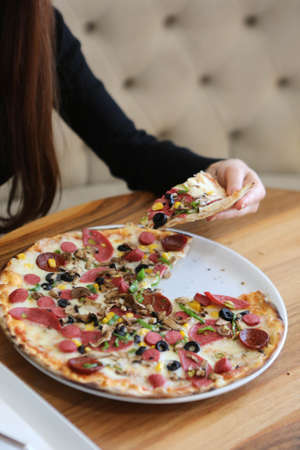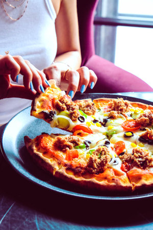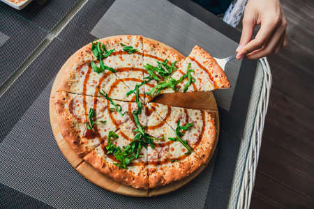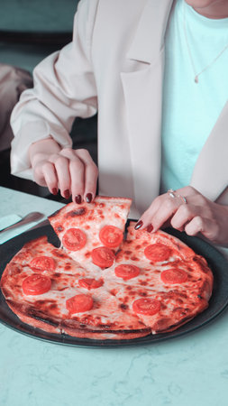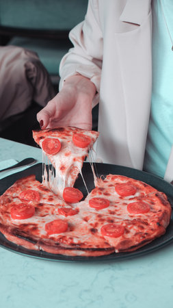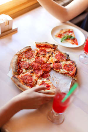 woman takes a hot piece of pizza with cheese, salami and pepperoni in italian cafe. top view