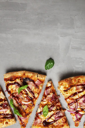 pizza background on a gray background with dark sweet and sour sauce and basil. with space for copyspace text. fast food.