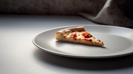A slice of pizza on a pink and white paper with shadows, AI