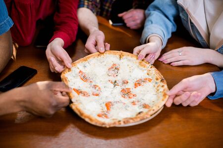 High angle shot of unrecognizable mixed race peoples hands each grabbing a slice of pizza
