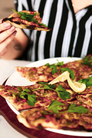 Traditional turkish baked dish pide. Turkish pizza pide, Middle eastern appetizers. Turkish cuisine. Pita with meat filling