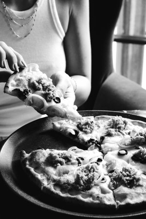 Female hands hold slice of pizza. Overhead view
