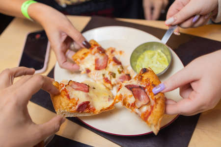 Sausage, vegetables, cheese, spices in the dough. Four hands from different sides take pieces of pizza from a wooden plate.