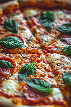Close-Up of Delicious Pepperoni Pizza with Melted Cheese, Fresh Basil, and Tomato Sauce