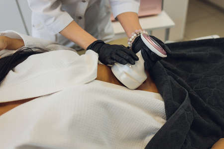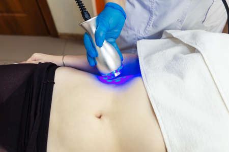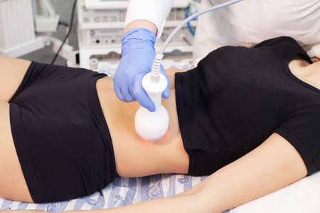 procedure removing cellulite on female abdomen, cavitation belly massage. Ultrasonic massage for weight loss. Correction of female figure without surgical intervention. Closeup of the tummy.