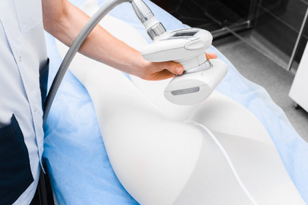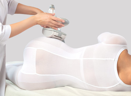 professional cosmetologist using ultrasound cavitation machine on a female buttock
