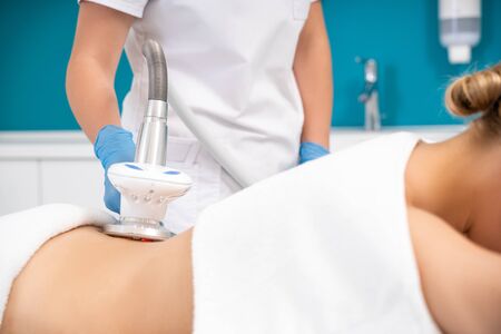 Cosmetologist treating shoulders of lady with a cavitation device in order to improve its quality