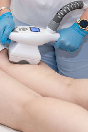 Close-up young woman in white suit undergoing liquid-type cosmetic massage and laser lipolysis. Cosmetic procedure, in a medical center. Anti-cellulite procedures.