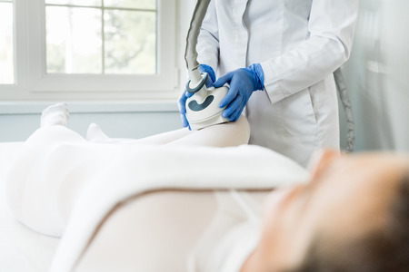 young woman getting cryolipolyse treatment in cosmetic cabinet