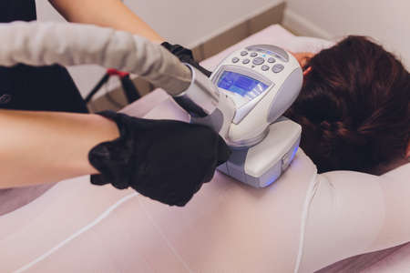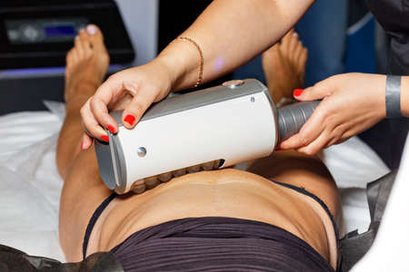 Non-invasive body contouring therapy. Cosmetologist applying hand probe to the lower back of a woman