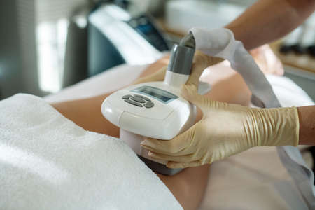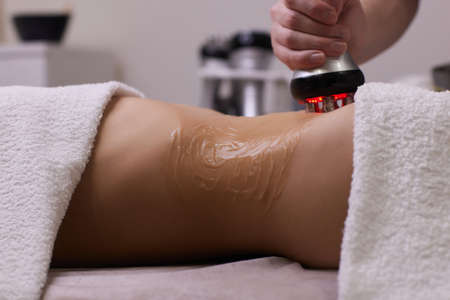 Woman getting anti-cellulite and anti-fat therapy in beauty salon. Hardware cosmetology. Body care. Spa treatment. Ultrasound cavitation body contouring