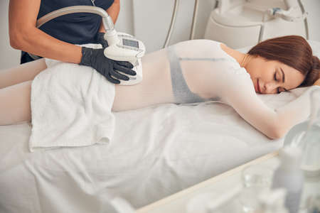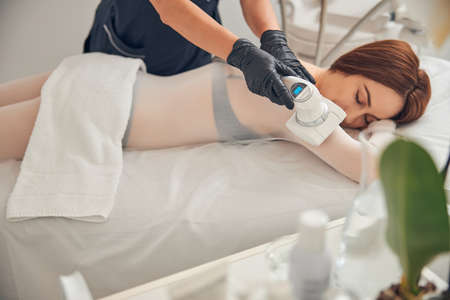 Young woman getting fat reductive skin lifting body treatment by a cosmetologist. Attractive female patient enjoying slimming body contouring procedure