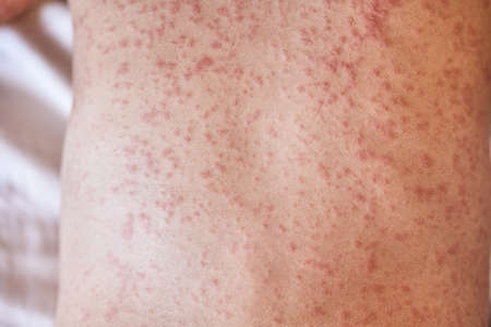 Sick child body, stomach with red rush spots from measles or chicken pox. Contagious child diseases and treatment.