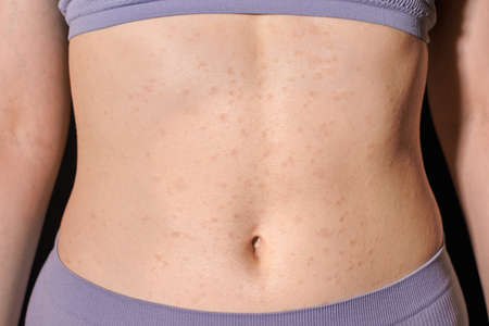 Skin allergy, female torso with red allergic rash on stomach skin, atopic dermatitis, eczema, inflammation. Young woman applying medical ointment on her itchy skin with fingers, heat rush treatment