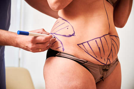 Specialist draws plastic surgery lines on female belly. Preparing patient for liposuction procedure. Correction marks for cosmetic liposuction of belly, closeup