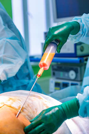cosmetic liposuction surgery in actual operating room, group of surgeons working with cannula