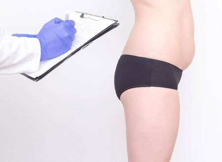 Close up of doctors hand drawing marks on patient skin of fat woman in underwear before plastic surgery. Concept of plastics, overweight and preparation for aesthetic surgery.