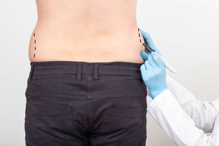 For clarity off proses doctor drawing a dashed line on areas of the patient’s body. Preparing for an operation to remove fat