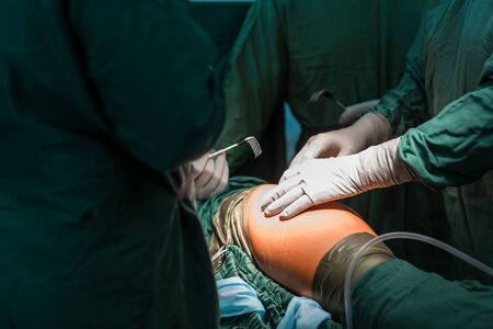 Process of trauma surgery operation. Group of surgeons in operating room with surgery equipment. Medical background