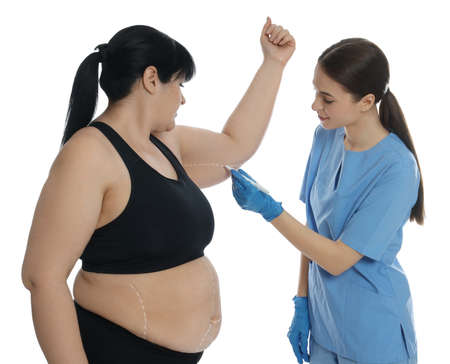 Doctor drawing marks on obese woman's body against white background. weight loss surgery