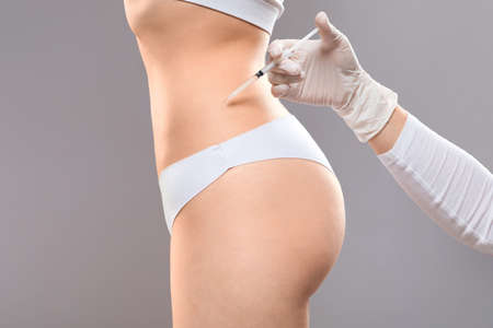 Beauty procedure for body. Slim woman having lipolysis treatment at beauty salon, closeup. Plastic surgeon making injection at belly area for unrecognizable lady, grey studio background, side view