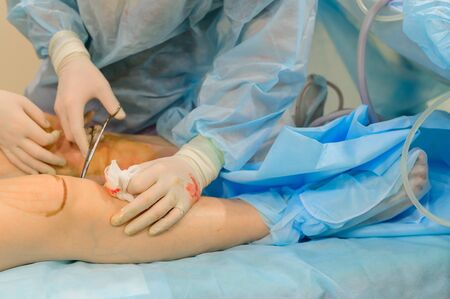 Surgeons suture their knees after liposuction. Close-up of plastic surgery to remove excess fat