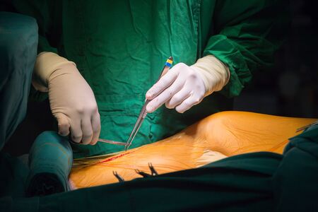 Surgery. View of hands of the surgeon tying the ligature. Sewing up the wound.