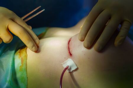 Close up of plastic surgeon hands in sterile gloves placing sutures after tummy tuck surgery in clinic. Doctor performing abdominal plastic surgery in operating room. Concept of abdominoplasty.